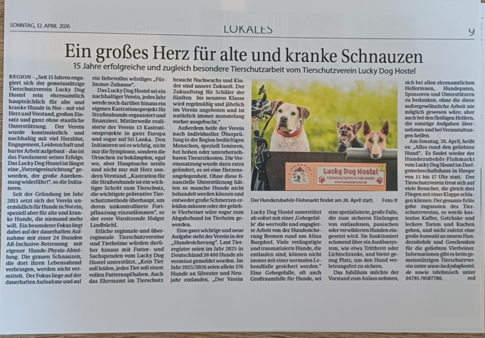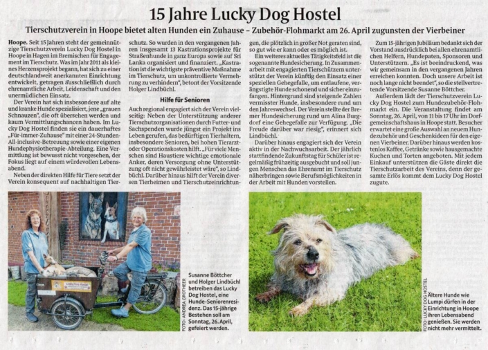 Berichterstattung im Weser Kurier am Sonntag über unsere ehrenamtliche Tierschutzarbeit von Lucky Dog Hostel, in der Rubrik "Unser Verein"